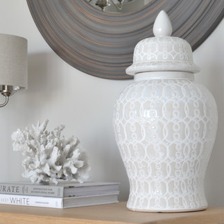 The Valletta Ginger Jar is a showstopping piece, featuring an intricate pattern in a classic shape. Whether used to hold florals or styled as a standalone decor item, this jar adds instant luxury to any room.